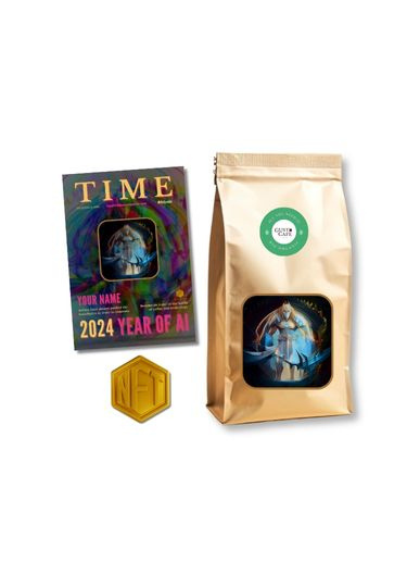 NFT znajdzie się na etykiecie kawy która jest stworzona przez sztuczną inteligencję. Kupując zestaw nabywasz prawo do 1% udziałów SuperPower.coffee Sp. z o.o.